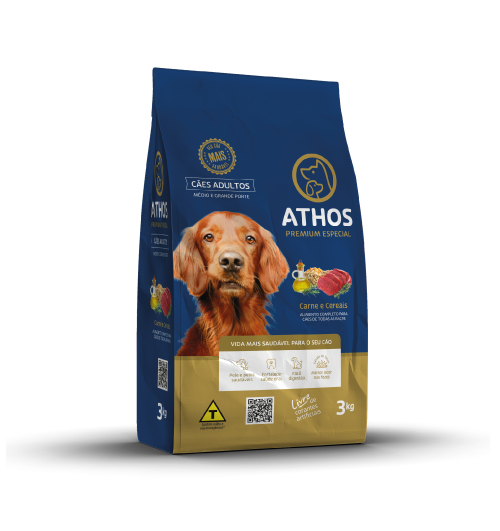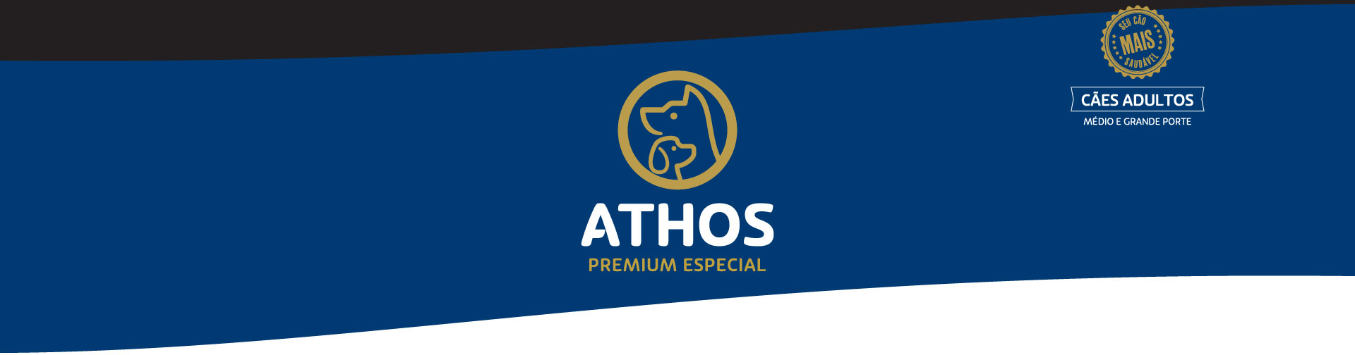 ATHOS DOG PREMIUM ADULTO é um alimento completo, contendo Proteínas, Carboidratos, Vitaminas, Minerais e Ácidos Graxos na qualidade e quantidade necessária ao desenvolvimento e manutenção da saúde e da beleza do seu cão.