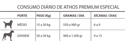 Fornecer a quantidade diária de ATHOS, nas quantidades sugeridas nesta embalagem. As quantidades diárias sugeridas geralmente são su cientes para que seu amiguinho permaneça forte e saudável, entretanto o consumo pode sofrer variações dependentes de raça, atividade física e características individuais. É sempre necessária a adaptação alimentar quando da troca do produto a ser fornecido, colocando 1/3 do produto novo nos primeiros 3 dias, metade por mais 3 dias e após somente o produto novo.